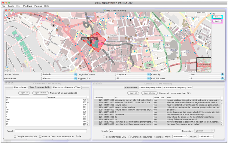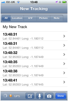 Fieldwork Tracker is a fairly simple application that continuously records the phone's GPS position in a timestamped log. Users can take photographs or movies, record audio, and make textual notes. Each of these media items also appears in the log with a timestamp (and a location). In the main interface we can filter the recoded items, showing just photographs or just notes etc. The buttons along the bottom show the different recording options, and there is an icon (showing red amber or green) to denote confidence in the GPS signal.